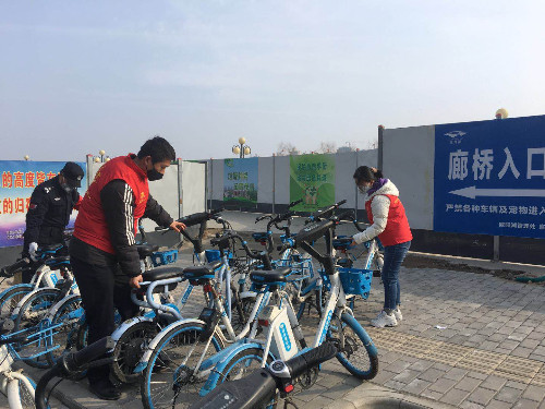 志愿者協(xié)助保安對廊橋引橋主口、西口的共享單車進(jìn)行規(guī)范擺放