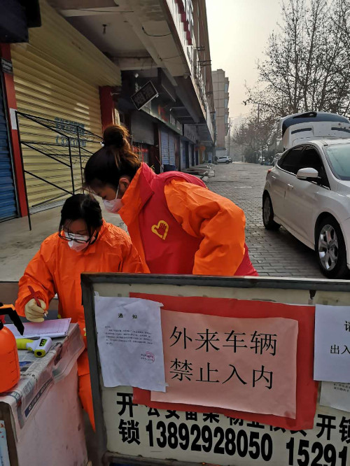 志愿者協(xié)助小區(qū)做好出入口人員測溫、信息登記工作