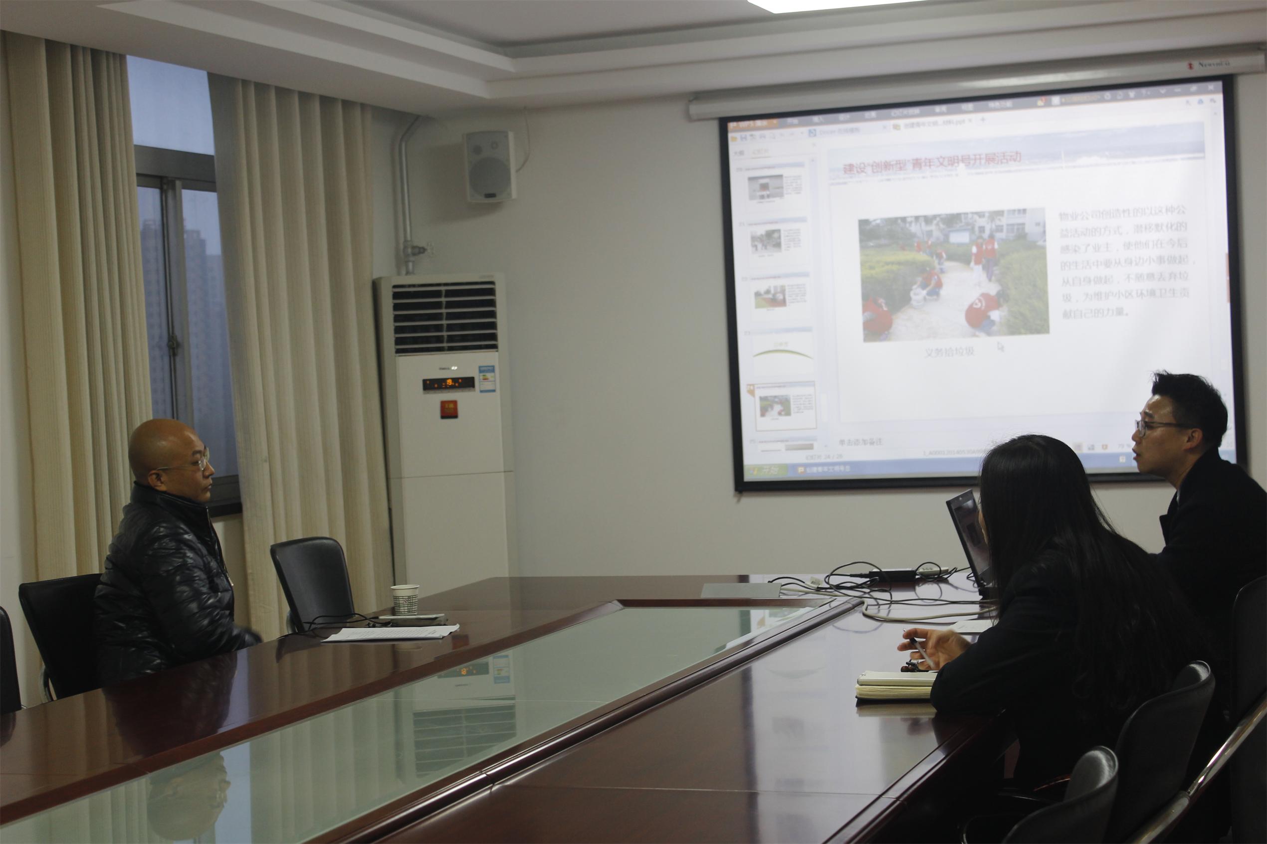 物業(yè)公司工會(huì)主席常紅艷,團(tuán)支部書記王崇屾代表公司干部員工對(duì)顧李斌一行的到來表示熱烈的歡迎。隨后王崇屾代表創(chuàng)建小組向檢查組匯報(bào)了物業(yè)公司近一年來創(chuàng)建工作的開展情況,匯報(bào)后,檢查組又對(duì)物業(yè)公司創(chuàng)建工作的有關(guān)資料和宣傳設(shè)施進(jìn)行了檢查。